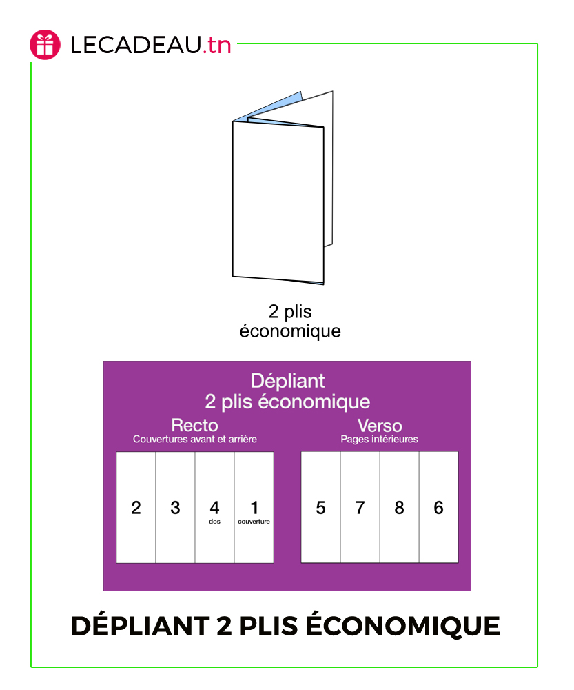 Le dépliant plis économique, utilisé pour des impressions sur des grands formats tels que le 63 x 29,7 cm (qui permet d’avoir un A4 lorsque le dépliant est fermé) ou sur du A3, grâce à son format original, il permet d’être lu comme une mini brochure avec ces deux plis internes et d’intégrer beaucoup d’informations.